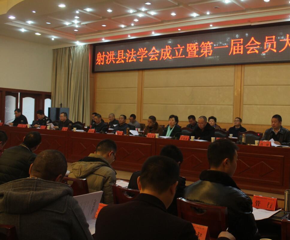 12月6日,射洪县召开法学会成立暨第一届会员大会。遂宁市委常委、政法委书记、市总工会主席、市法学会会长周霖临,市委政法委副书记唐建军,市大调解中心副主任、市法学会秘书长郭小菊,县委副书记袁渊,县委常委、政法委书记黄小文,县人大副主任任德武,县法院院长杨清明,县检察院检察长段雄等市、县领导出席参加会议,副县长、县公安局局长陈良主持会议。